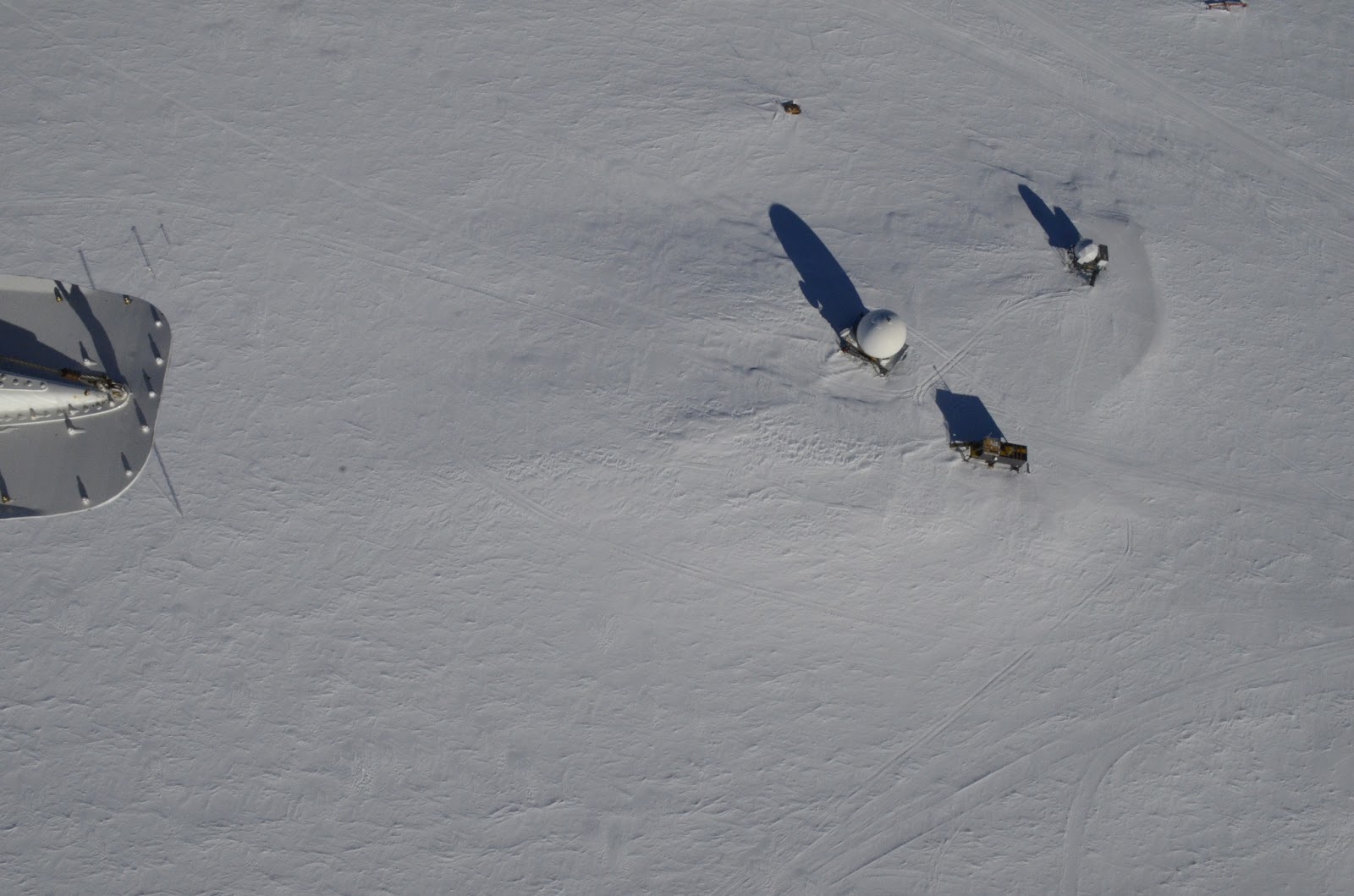 | The two radomes that house the three antennas along with the RF building. In the foreground is the ski of the Otter. |